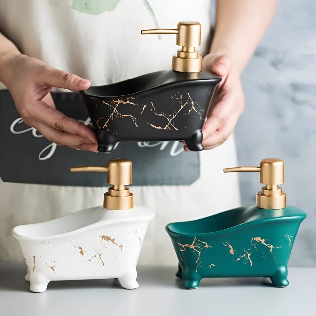 Unlike ordinary plastic bottles, this dispenser is crafted from smooth, durable ceramic that feels solid and luxurious to the touch. The glossy finish adds a clean, polished look, while the bathtub-inspired shape brings a touch of creativity that guests will notice right away. It’s a small detail that makes a big visual impact.