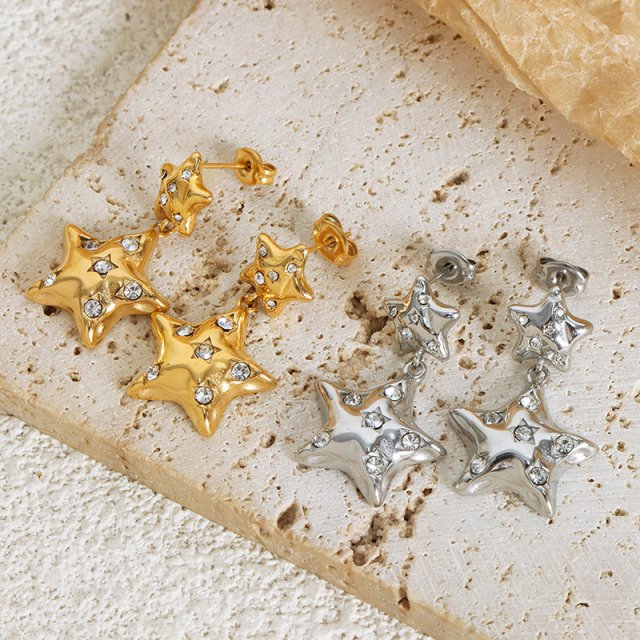 Crafted from durable stainless steel, these fashion earrings combine strength with elegance. The layered star design adds depth and movement, while the full rhinestone finish delivers a high-shine, premium look. Despite their dramatic appearance, they are comfortable enough to wear for hours. The drop style elongates the neckline, making them flattering for many face shapes and hairstyles.